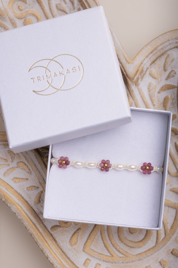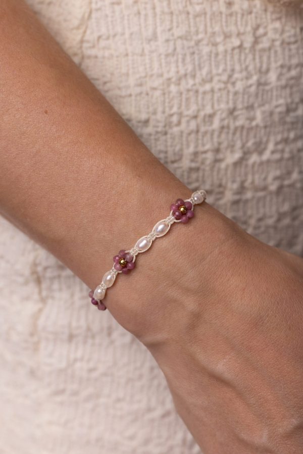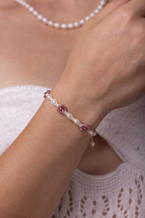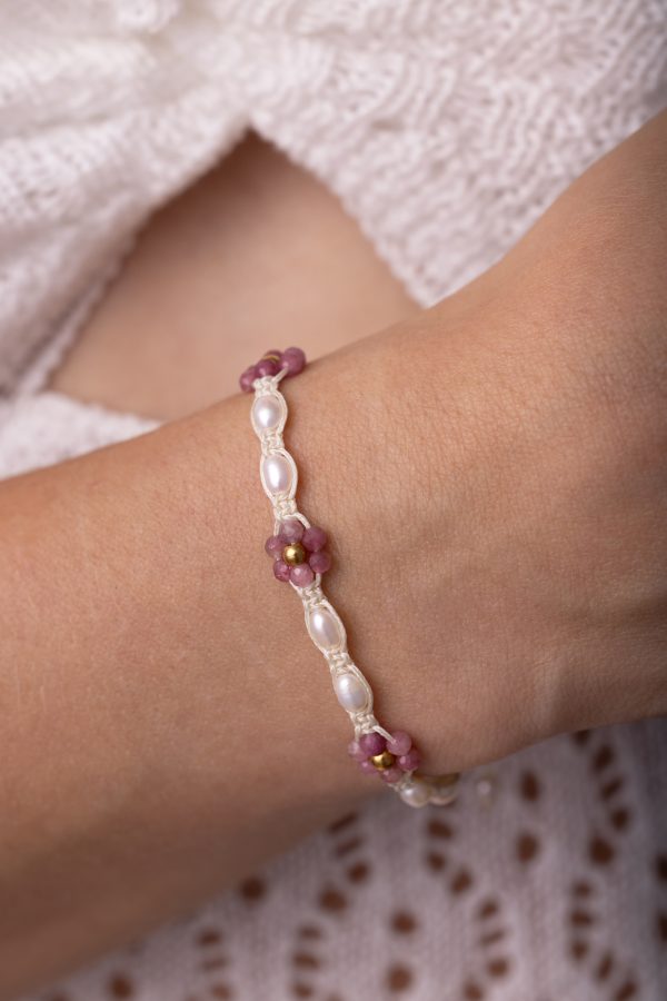 Damska bransoletka z naturalnego różowego turmalinu i pereł inspirowana motywem kwiatu – symbolem wzrostu, piękna i odwagi, by rozkwitnąć.